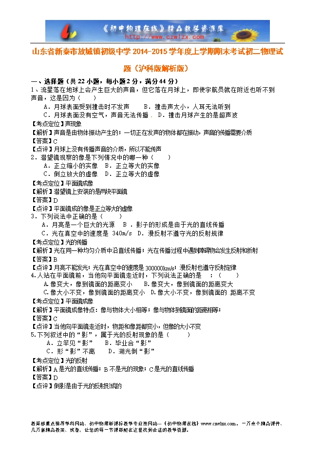 山东省新泰市放城镇初级中学2014-2015学年度上学期期末考试初二物理试题(沪科版解析版)