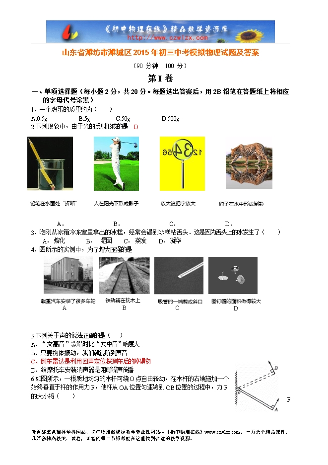 山东省潍坊市潍城区2015年初三中考模拟物理试题及答案