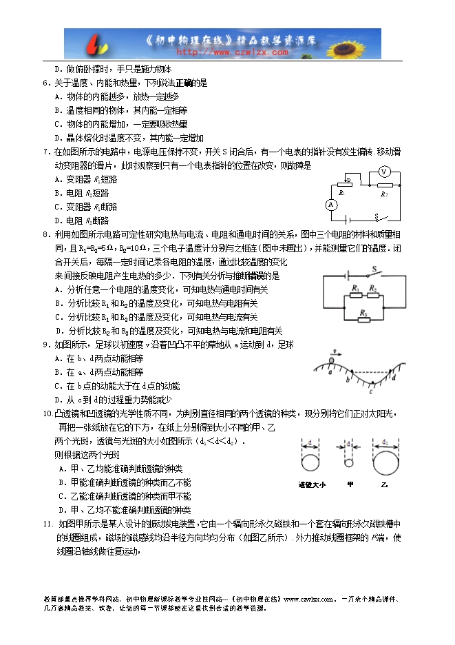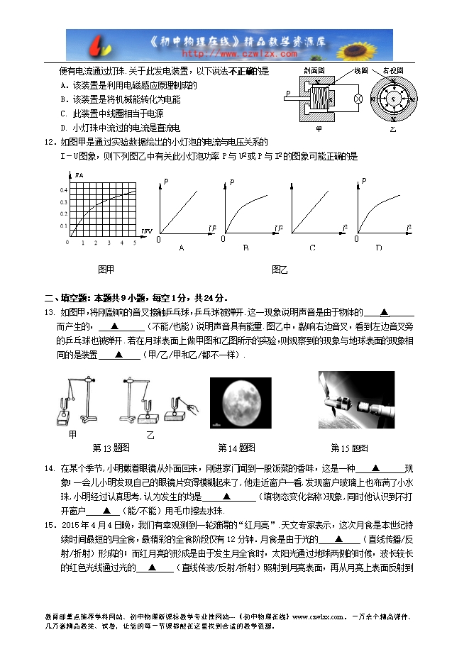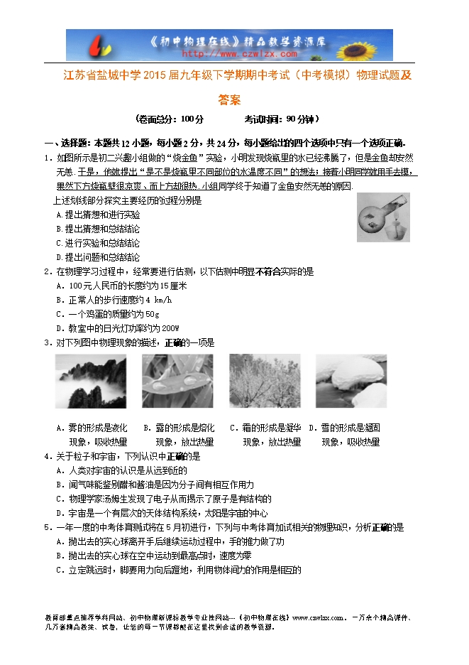江苏省盐城中学2015届九年级下学期期中考试(中考模拟)物理试题及答案