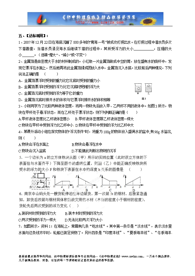 3、当重力大于浮力时,物体就要 ;当重力小于浮力时,物体就要 ;当重力等于浮力时,物体就会 或 ;