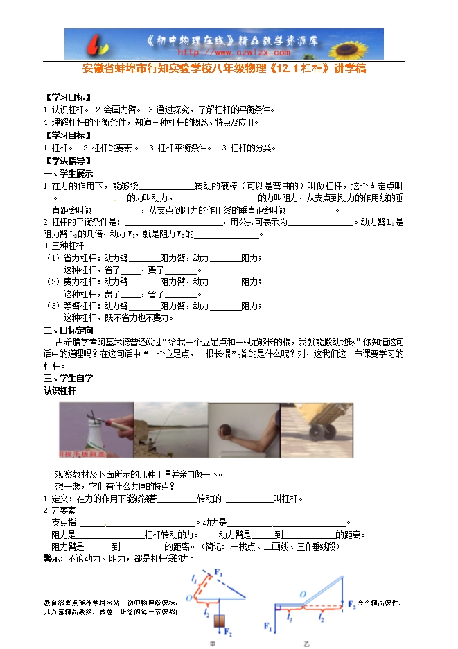 安徽省蚌埠市行知实验学校八年级物理《12.1杠杆》讲学稿