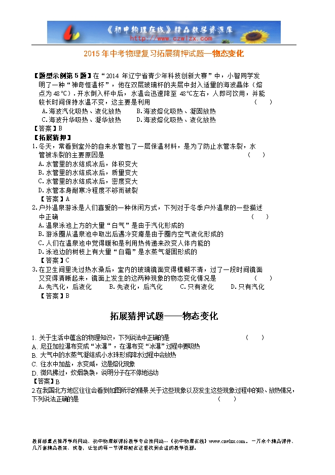 明了一种“神奇恒温杯”,他在双层玻璃杯的夹层中封入适量的海波晶体(熔