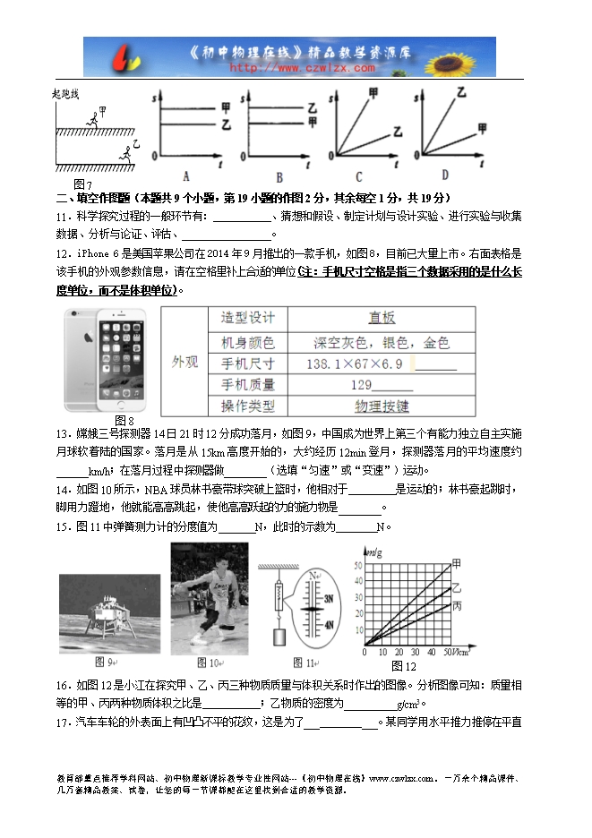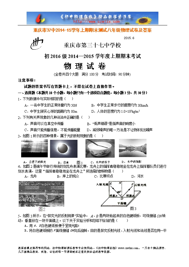 重庆市37中2014-15学年上期期末测试八年级物理试卷及答案