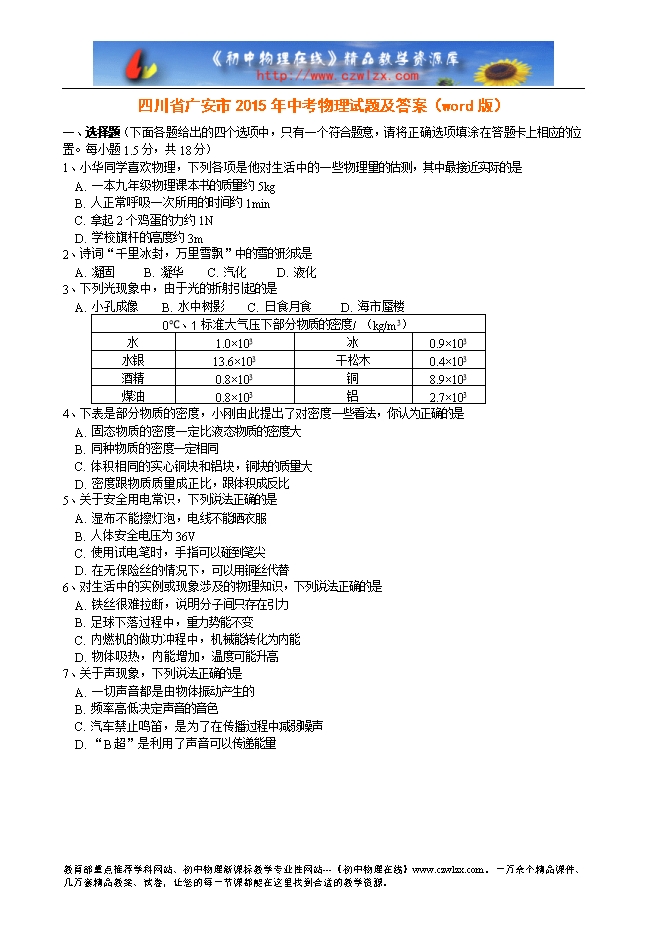 1、小华同学喜欢物理,下列各项是他对生活中的一些物理量的估测,其中最接近实际的是