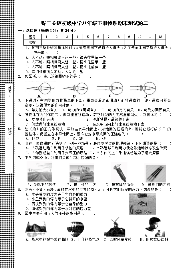 湖北省巴东县野三关镇初级中学2015年物理八年级下册期末模拟测试题2(word版有答案)