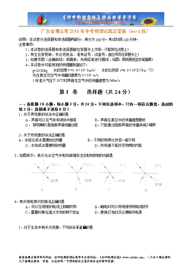 1标准大气压下15℃时声音在空气中的传播速度为340m/s第Ⅰ 卷 选择题(共24分)