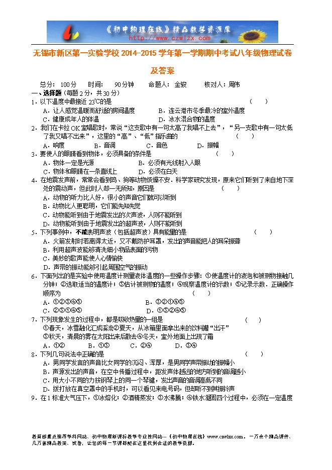无锡市新区第一实验学校2014-2015学年第一学期期中考试八年级物理试卷及答案
