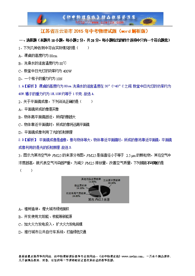 江苏省连云港市2015年中考物理试题(word解析版)