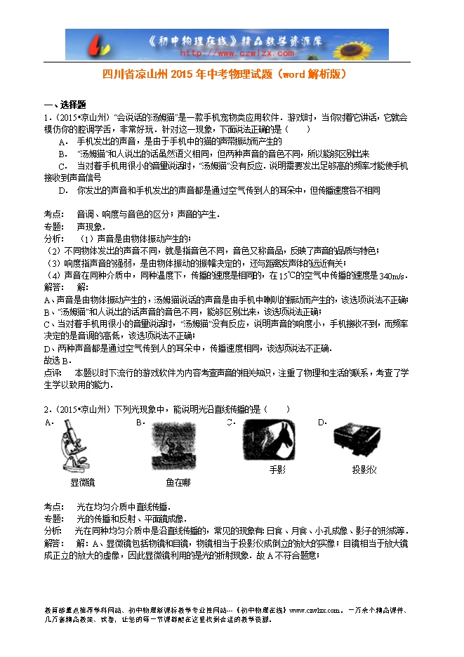1.(2015•凉山州)“会说话的汤姆猫”是一款手机宠物类应用软件.游戏时,当你对着它讲话,它就会模仿你的腔调学舌,非常好玩.针对这一现象,下面说法正确的是( )