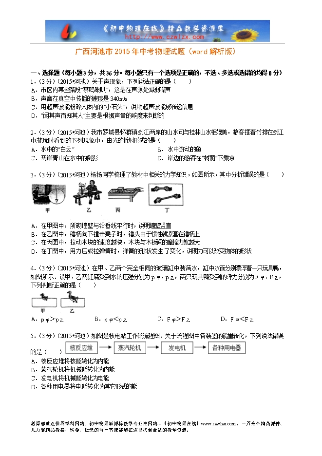 1.(3分)(2015•河池)关于声现象,下列说法正确的是( )