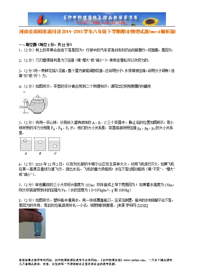 河南省南阳市淅川县2014-2015学年八年级下学期期末物理试题(word解析版)