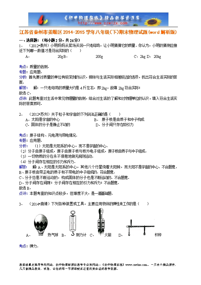 1. (2012?泰州)小明妈妈从菜场买回一只老母鸡,让小明猜猜它的质量.你认为,小明的猜测应接近下列哪一数值才是符合实际的( )