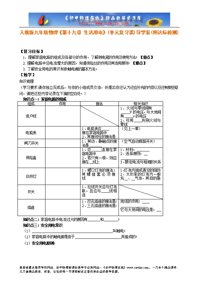 人教版九年级物理《第十九章 生活用电》(单元复习课)导学案(附达标检测)