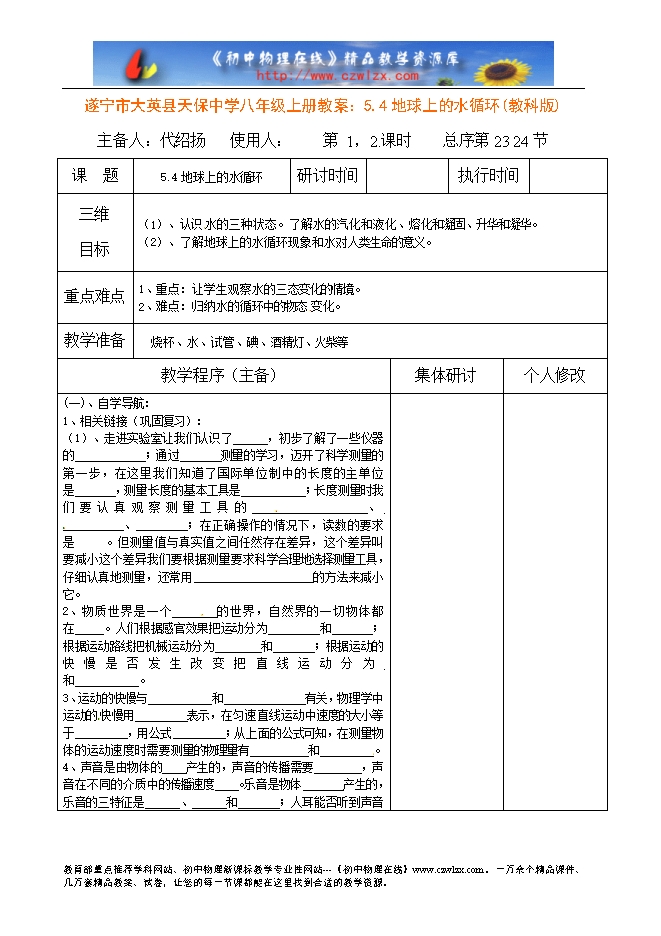 遂宁市大英县天保中学八年级上册教案:5.4地球上的水循环(教科版)