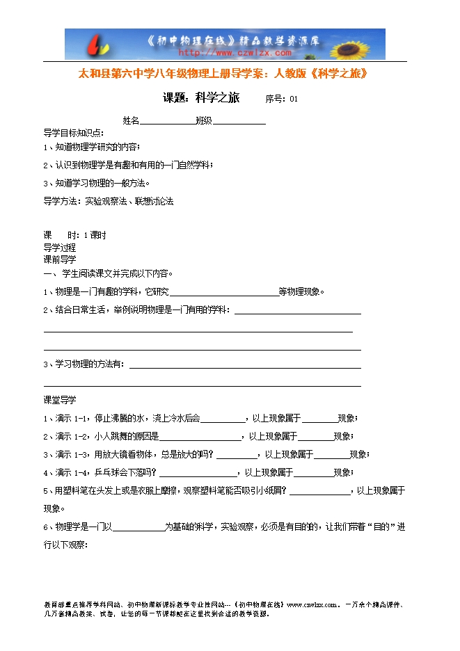 太和县第六中学八年级物理上册导学案:人教版《科学之旅》