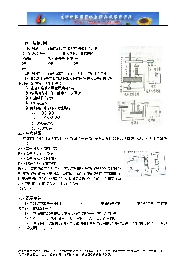 广东省惠州市惠东县港口中学《15.4电磁继电器与自动控制》学案(附达标练习和课堂测评,沪粤版)