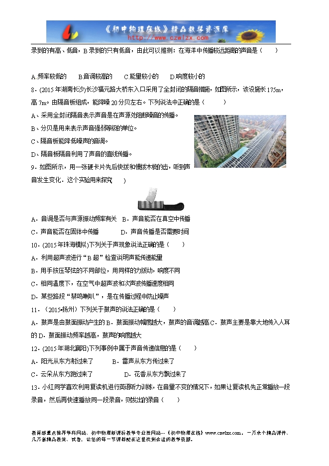 3.(2015年鄂州)《中国好声音》是一档大型励志专业音乐评论节目,也是深受观众欢迎和喜爱的唱歌类娱乐节目。在节目中常常听到导师们说:“某某某,你的声音有很强的辨识度,我很喜欢。”这里所说的“辨识度”主要是指选手唱歌时声音的( )