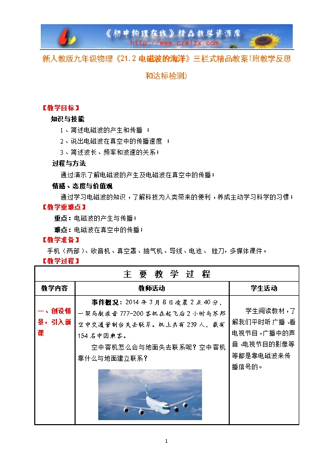 新人教版九年级物理《21.2电磁波的海洋》三栏式精品教案(附教学反思和达标检测)