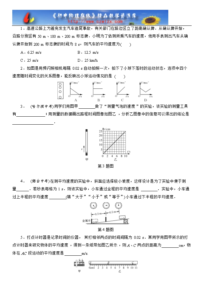 3.误差分析:若测得的路程偏大,时间偏小,则测出的速度会偏大;反之速度偏小.