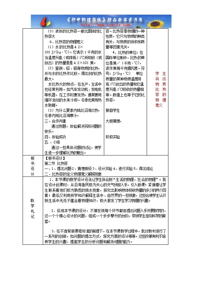 三、情感、态度与价值观 1、学会交流与讨论,培养学生的团队精神。 2、通过对比热容的应用了解初步认识科学技术对人类生活的影响,逐步树立科学的世界观。