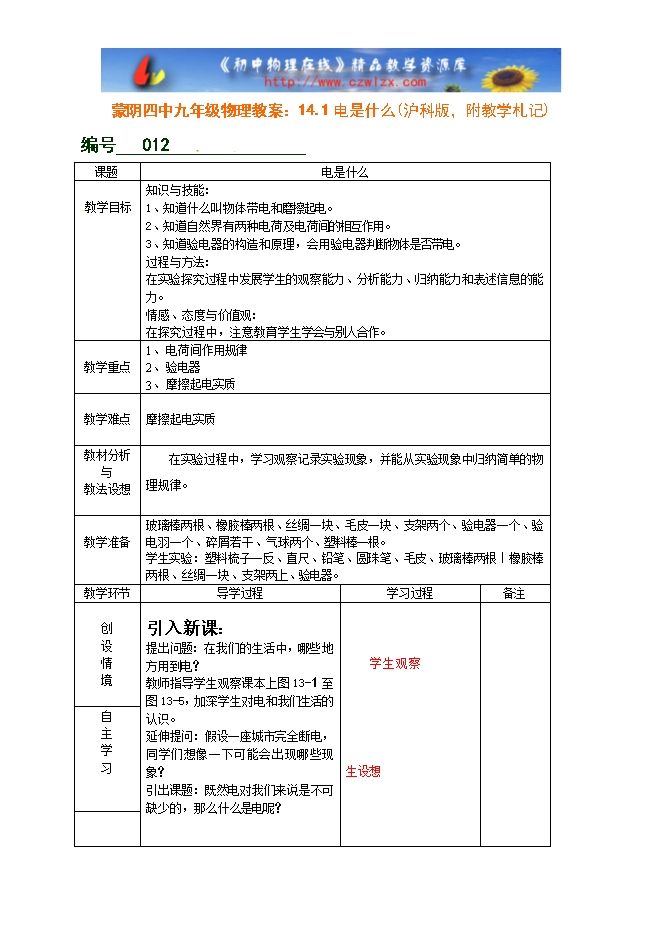 蒙阴四中九年级物理教案:14.1电是什么(沪科版,附教学札记)