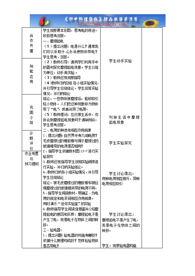 【内容简介】教学目标 知识与技能: 1、知道什么叫物体带电和磨擦起电。 2、知道自然界有两种电荷及电荷间的相互作用。 3、知道验电器的构造和原理,会用验电器判断物体是否带电。 过程与方法: 在实验探究过程中发展学生的观察能力、分析能力、归纳能力和表述信息的能力。 情感、态度与价值观: 在探究过程中,注意教育学生学会与别人合作。 教学重点 1、 电荷间作用规律 2、 验电器 3、 摩擦起电实质 教学难点 摩擦起电实质 教材分析与 教法设想 在实验过程中,学习观察记录实验现象,并能从实验现象中归纳简单的物理规律。 教学准备 玻璃棒两根、橡胶棒两根、丝绸一块、毛皮一块、支架两个、验电器一个、验电羽一个、碎屑若干、气球两个、塑料棒一根。 学生实验:塑料梳子一反、直尺、铅笔、圆珠笔、毛皮、玻璃棒两根|橡胶棒两根、丝绸一块、支架两上、验电器。 教学环节 导学过程 学习过程 备注 创设情境 引入新课:提出问题:在我们的生活中,哪些 地方用到电? 教师指导学生观察课本上图13-1至图13-5,加深学生对电和我们生活的认识。 延伸提问:假设一座城市完全断电,同学们想像一下可能会出现哪些现象? 引出课题:既然电对我们来说是不可缺少的,那么什么是电呢? ....... ?