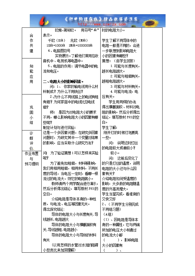 【教学重点】 探究决定电阻大小的因素;变阻器的构造和使用方法。