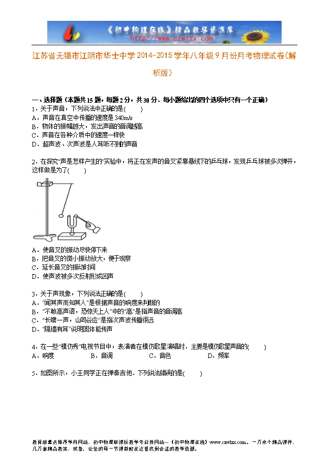 江苏省无锡市江阴市华士中学2014-2015学年八年级9月份月考物理试卷(解析版)
