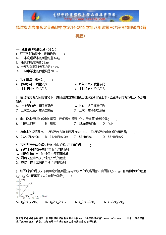 福建省龙岩市永定县高陂中学2014-2015学年八年级第三次段考物理试卷(解析版)