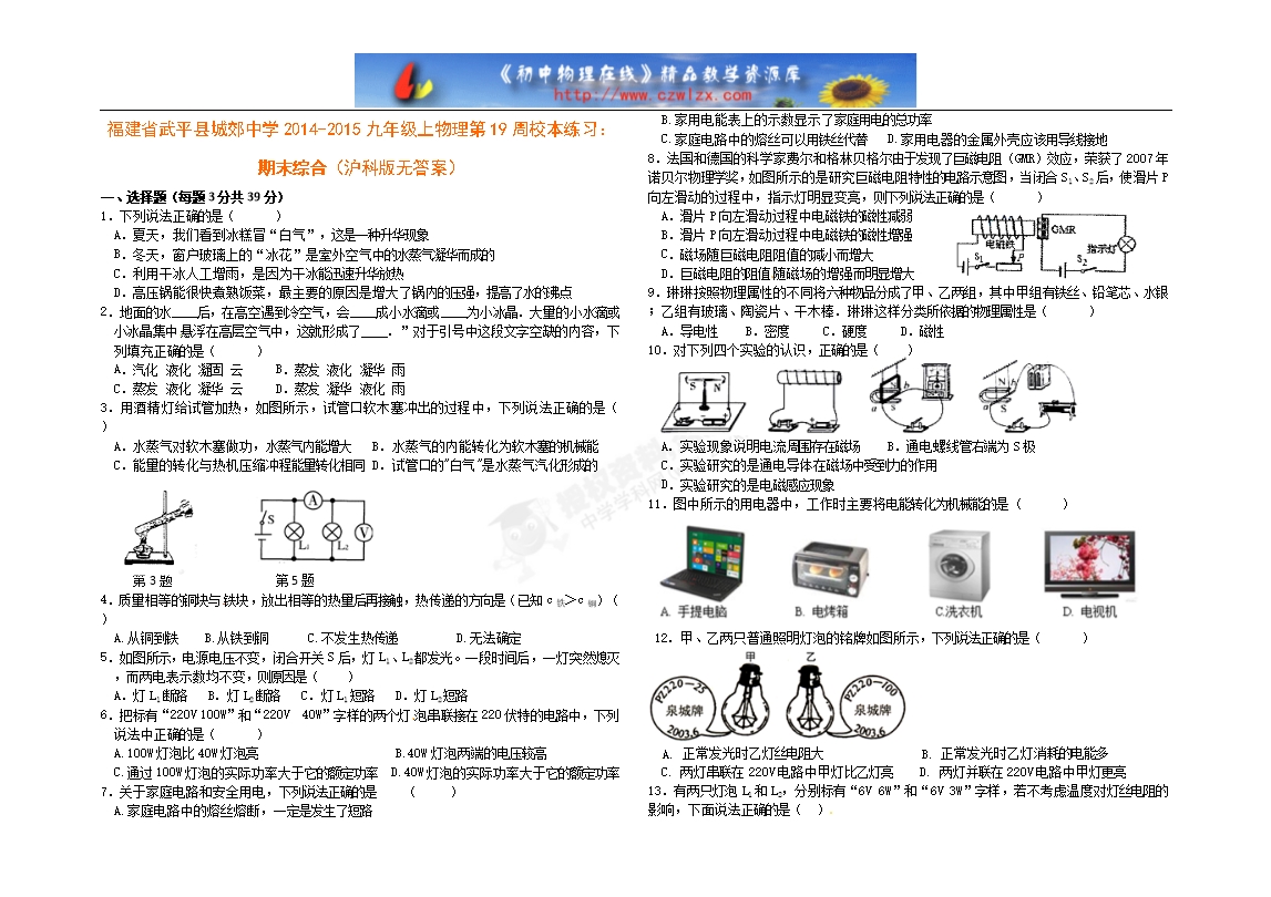 福建省武平县城郊中学2014-2015九年级上物理第19周校本练习: 期末综合(沪科版无答案)