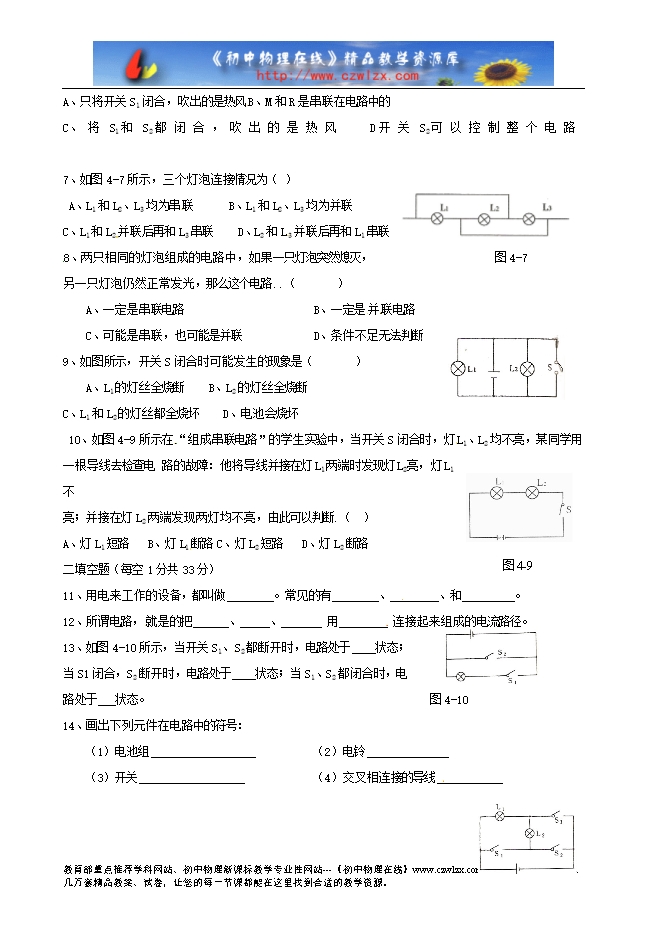 3、在下图4-3所示 的电路中,开关S能控制电灯和 电铃的正确电路是( )