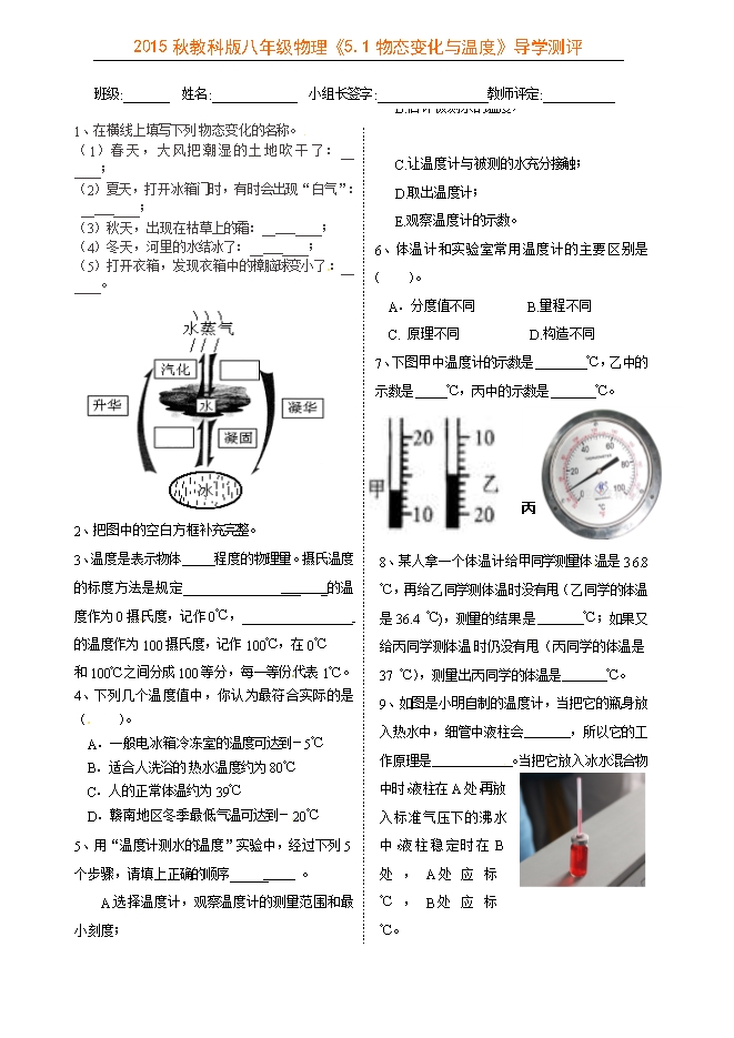 2015秋教科版八年级物理《5.1物态变化与温度》导学测评