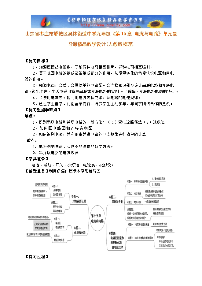 山东省枣庄市峄城区吴林街道中学九年级《第15章 电流与电路》单元复习课精品教学设计(人教版物理)