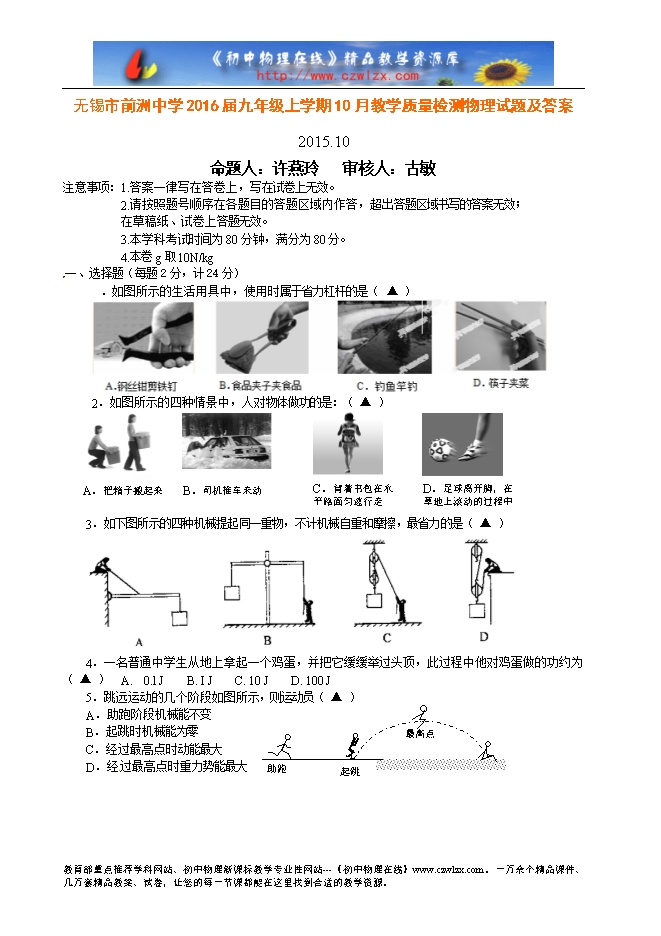 无锡市前洲中学2016届九年级上学期10月教学质量检测物理试题及答案