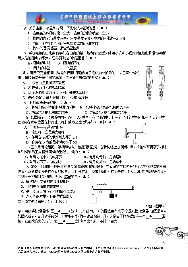 6.关于温度、热量和内能,下列说法中正确的是( ▲ )