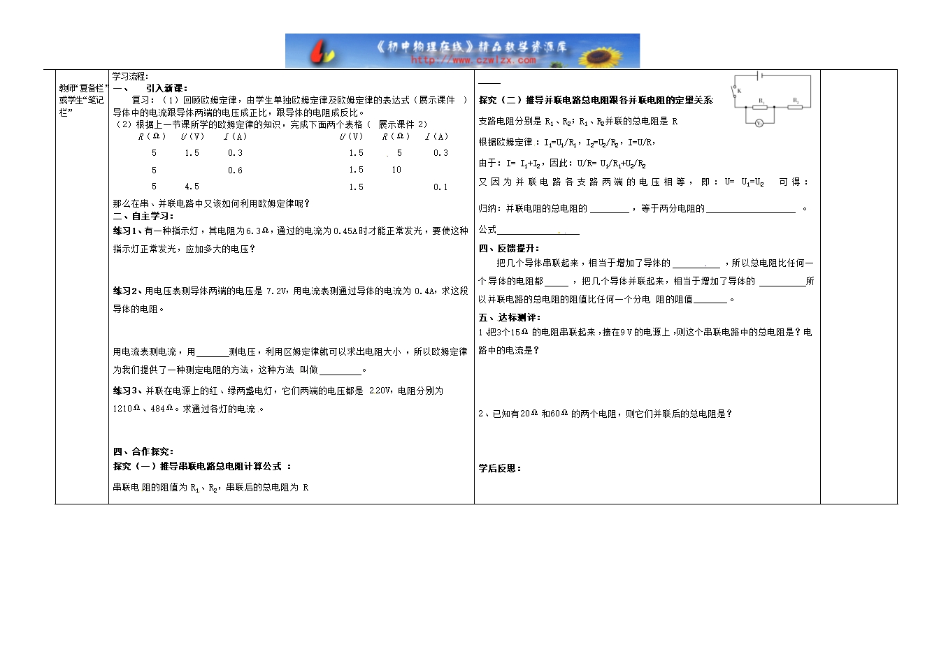 河南省濮阳市范县濮城镇中学2016届九年级物理上册导学案:17.4欧姆定律在串、并联电路中的应用