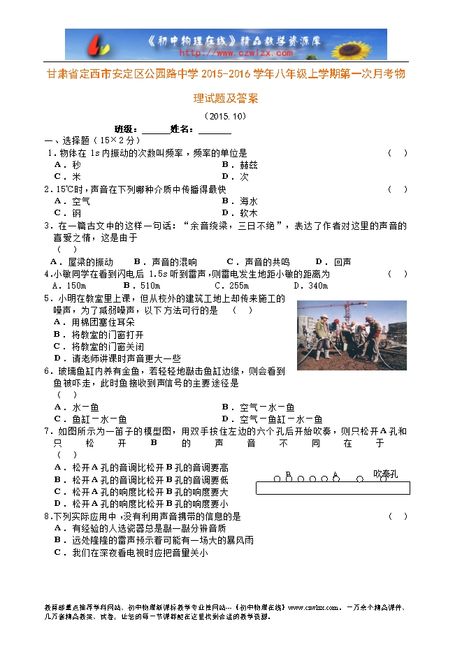 甘肃省定西市安定区公园路中学2015-2016学年八年级上学期第一次月考物理试题及答案