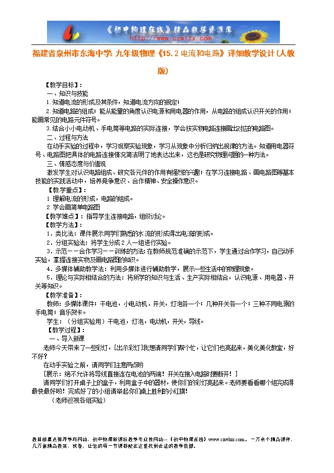 福建省泉州市东海中学:九年级物理《15.2电流和电路》详细教学设计(人教版)