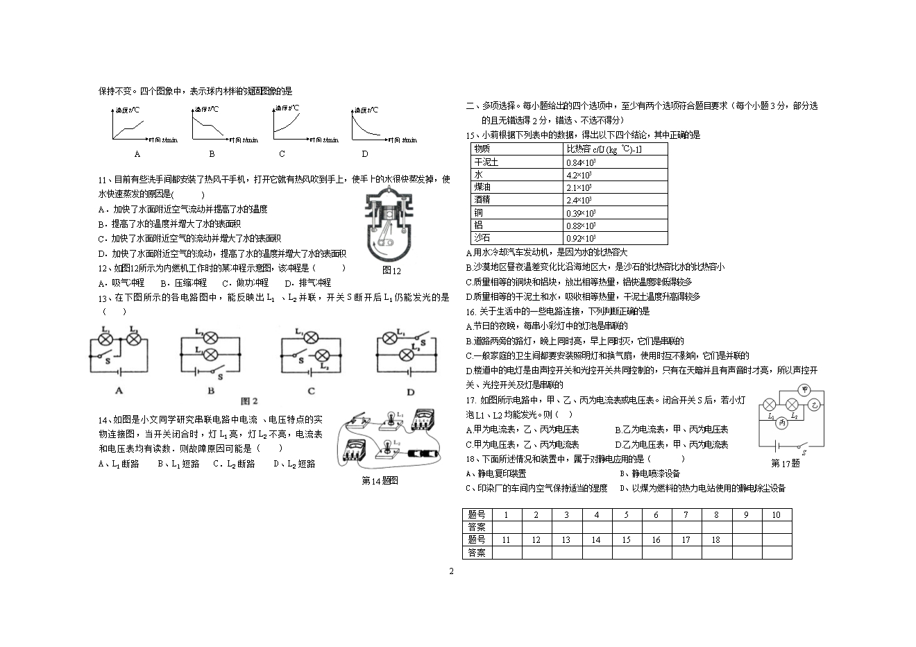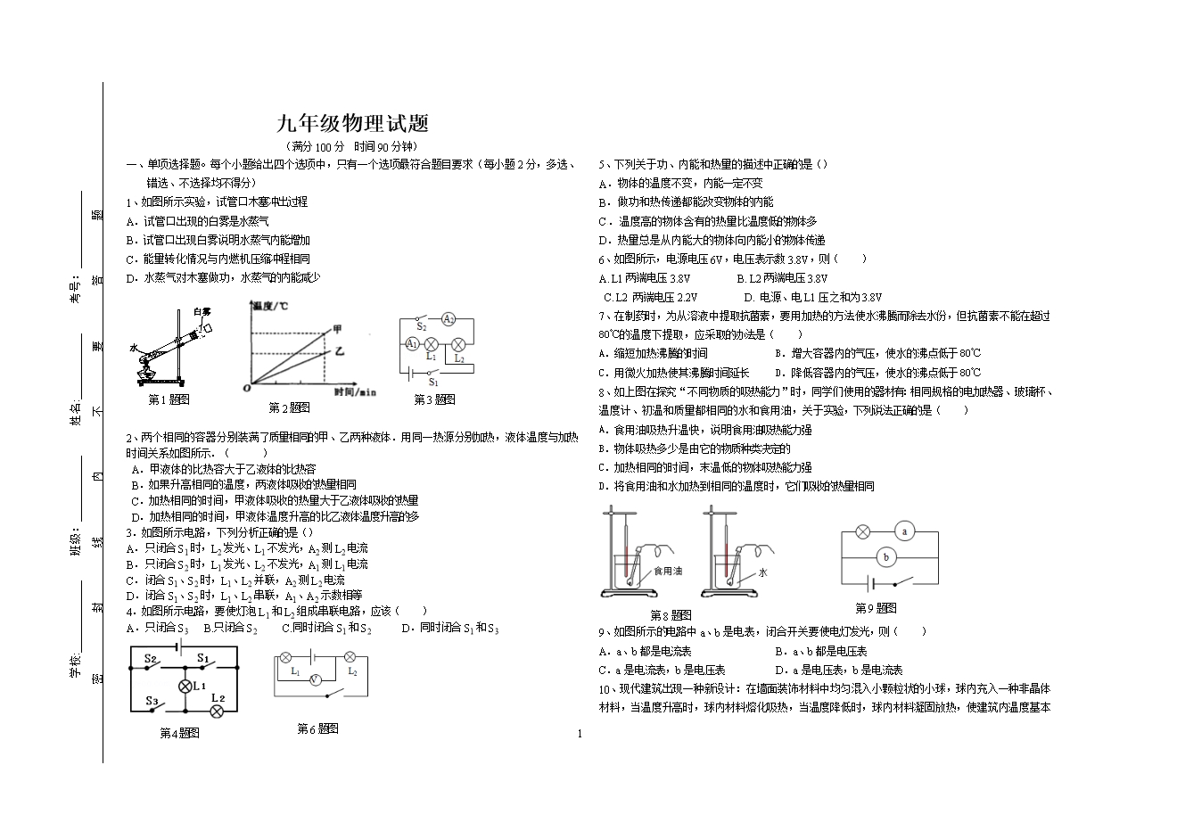 - 2967山东省济宁市微山县第二实验中学2015年10月九年级学业评测物理试题及答案(沪科版)