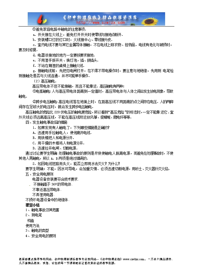 2.本着理论联系实际的原则,在生活中能自觉地按照安全用电的 要求去做.对话形式增强了教材的趣味性和可读性.在家用电器日益普及的情况下,学习和宣传安全用电的知识,既是物理教学的需要,也是进行素质教育的必修课.