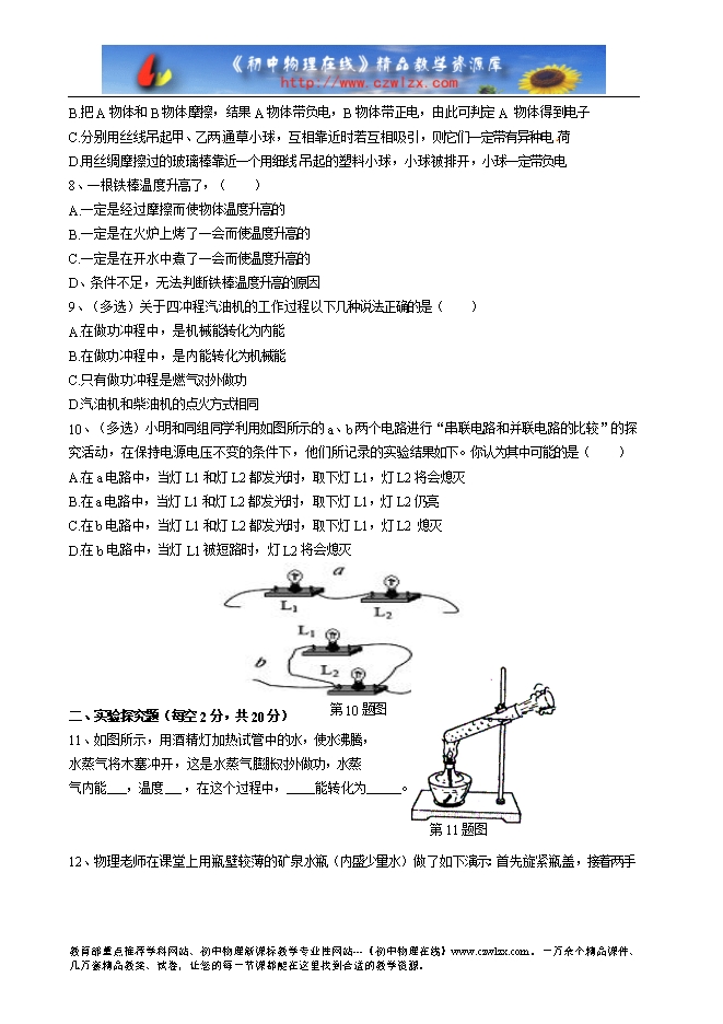 - 2967山东省济宁市微山县第二实验中学2015年10月九年级学业评测物理试题及答案(沪科版)