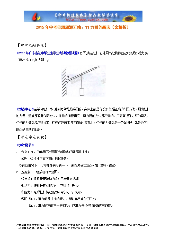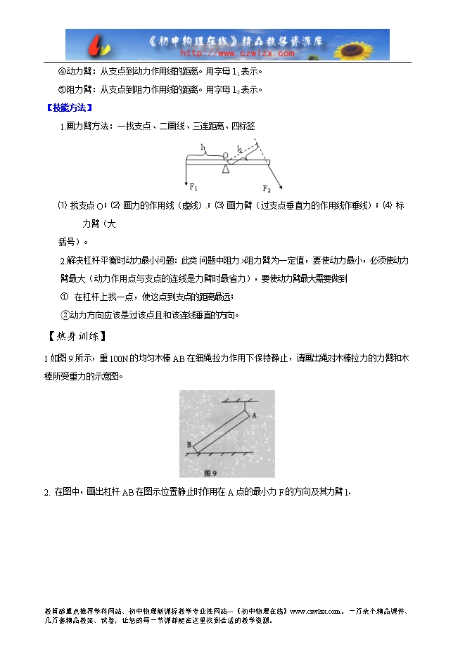 【难点中心】在学习杠杆时,感到力臂是最难画的,实际上那是你没有掌握正确的作图方法。画出杠杆的力臂,重点是掌握作图方法,杠杆的问题 再变,画力臂的方法是不变的,只要掌握住力臂的画法,杠杆的力臂就能正确找出,杠杆问题就能迎刃而解。实际上,杠杆的力臂就是一条垂线段,就是数学上的点到直线的距离。