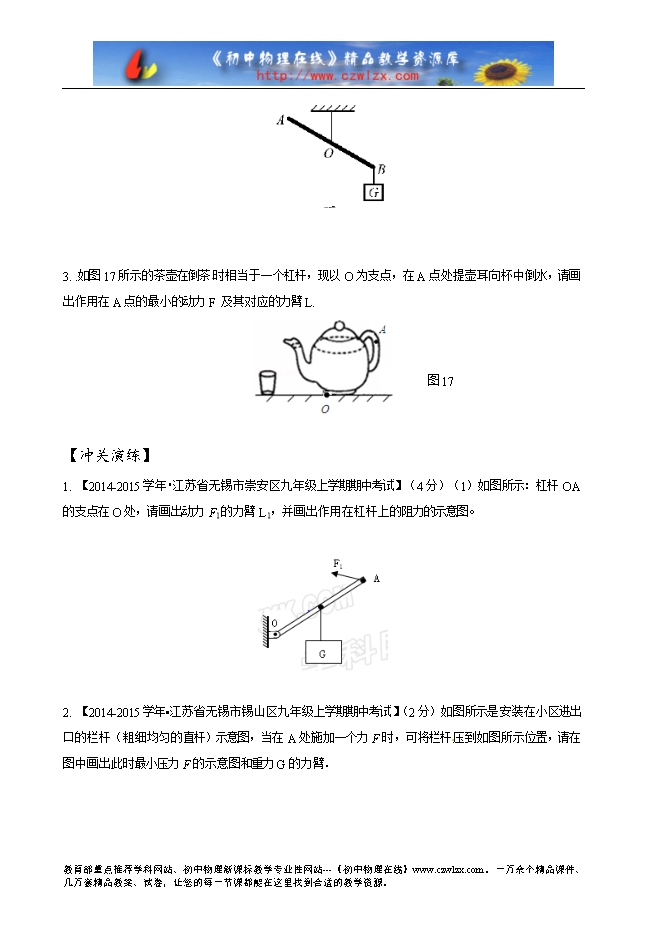 2.解决杠杆平衡时动力最小问 题:此类 问题中阻力 ×阻力臂为一定值,要使动力最小,必须使动力臂最大(动力作用点与支点的连线是力臂时最省力),要使动力臂最大需要做到