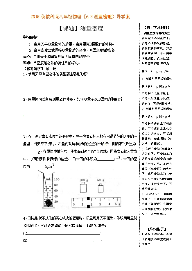 2015秋教科版八年级物理《6.3测量密度》导学案