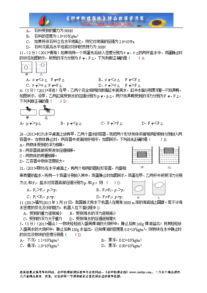 2015年全国中考物理110套试题分类汇编:10浮力