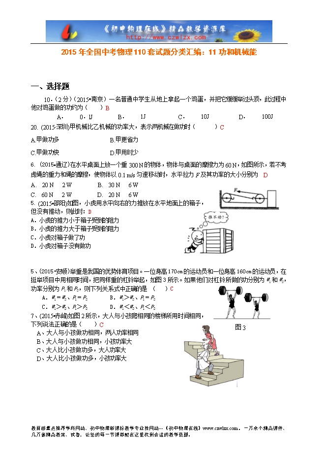 2015年全国中考物理110套试题分类汇编:11功和机械能