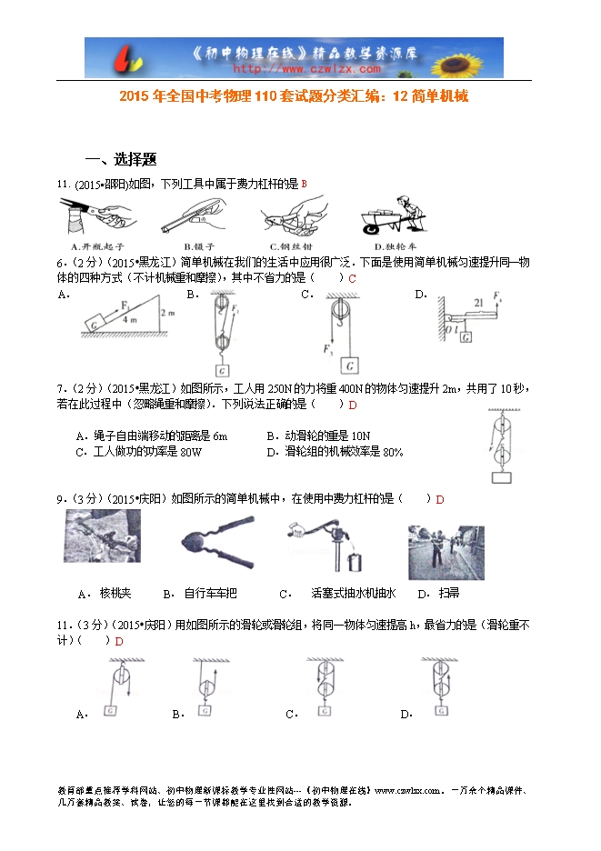 2015年全国中考物理110套试题分类汇编:12简单机械