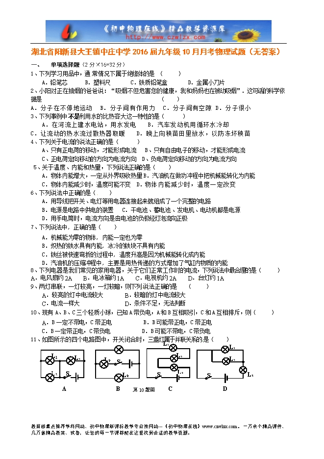 湖北省阳新县大王镇中庄中学2016届九年级10月月考物理试题(无答案)