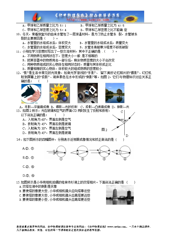 7. 图1中,正确表示光从水斜射 入空气的情况的是( )