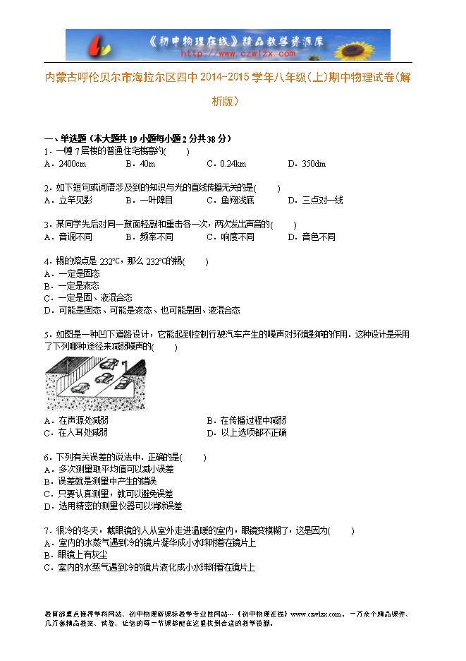 内蒙古呼伦贝尔市海拉尔区四中2014-2015学年八年级(上)期中物理试卷(解析版)